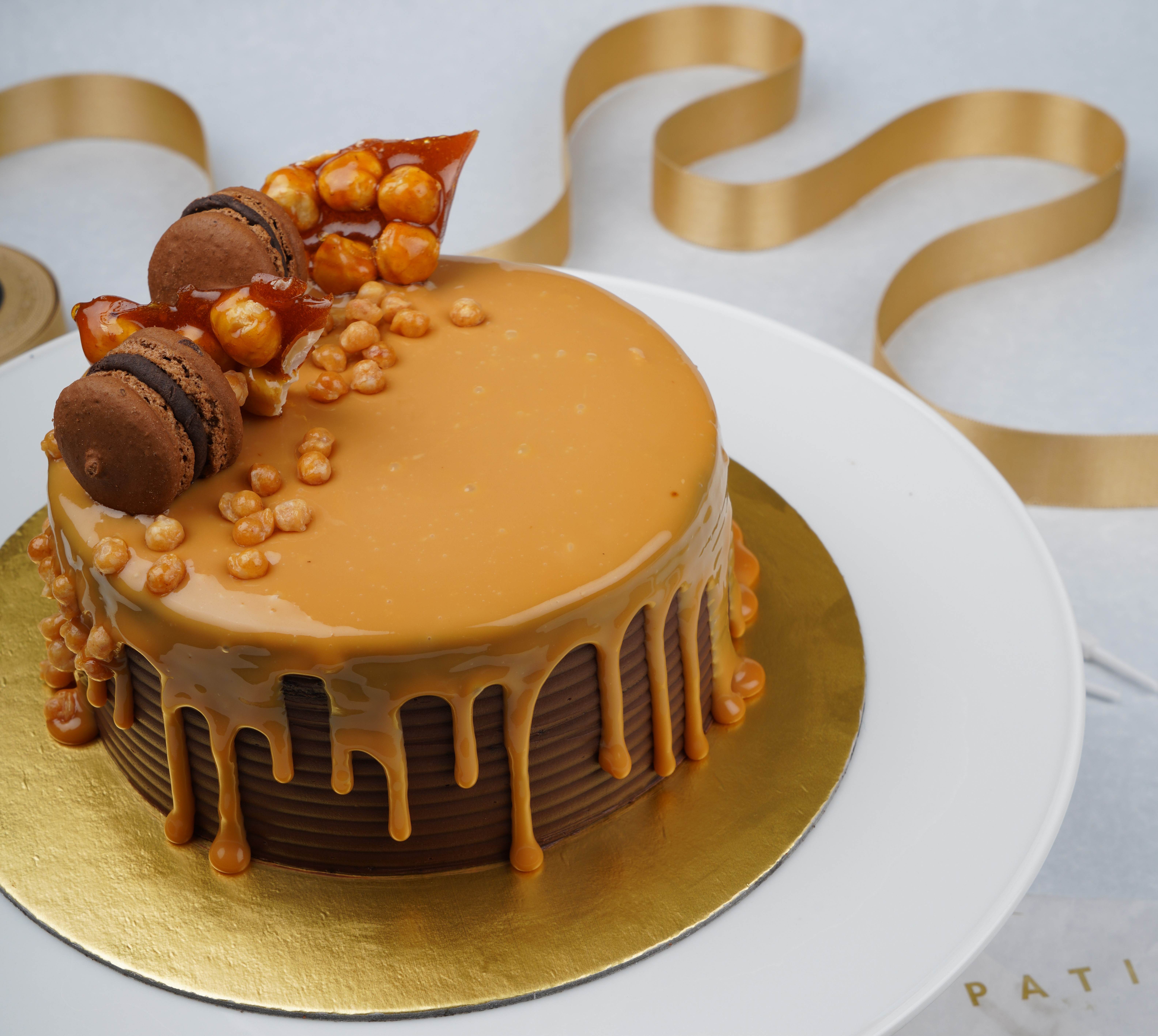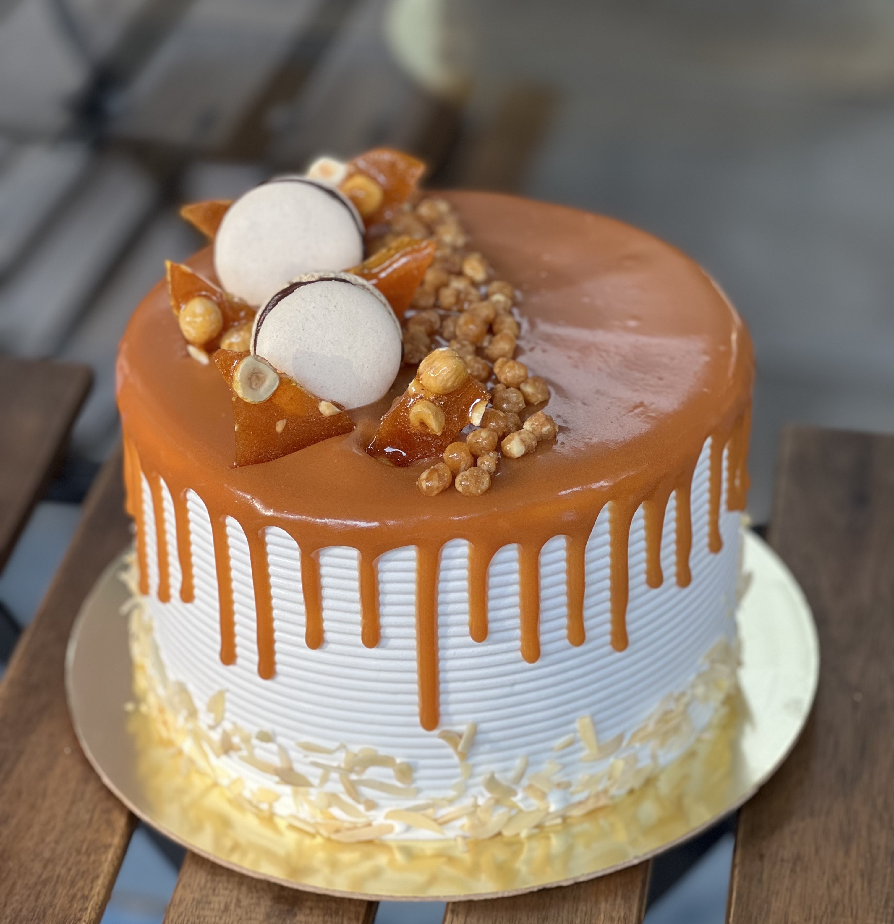 Layered vanilla sponge, almond, and caramel masterpiece.
