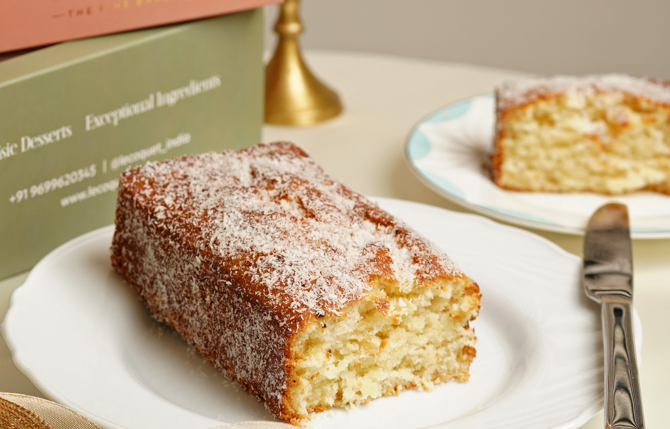 Our own creation, a moist coconut cake made using coconut milk and grated coconut with subtle flavours