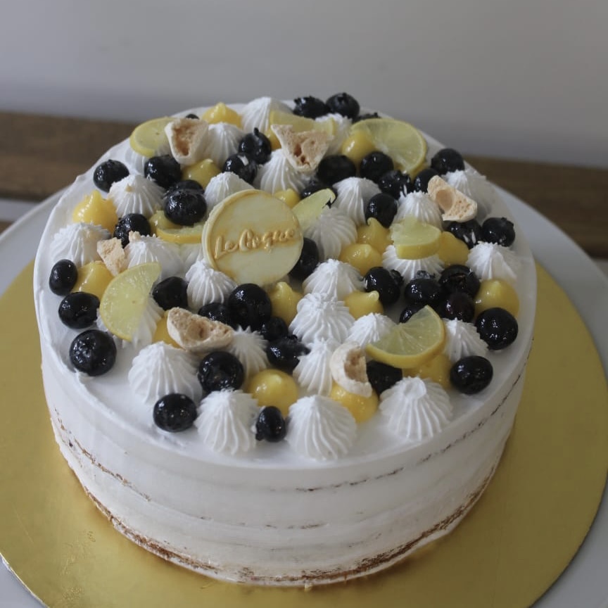 Refreshing lemon cake layered with mascarpone cream, fresh blueberry compote, and a tangy lemon curd.