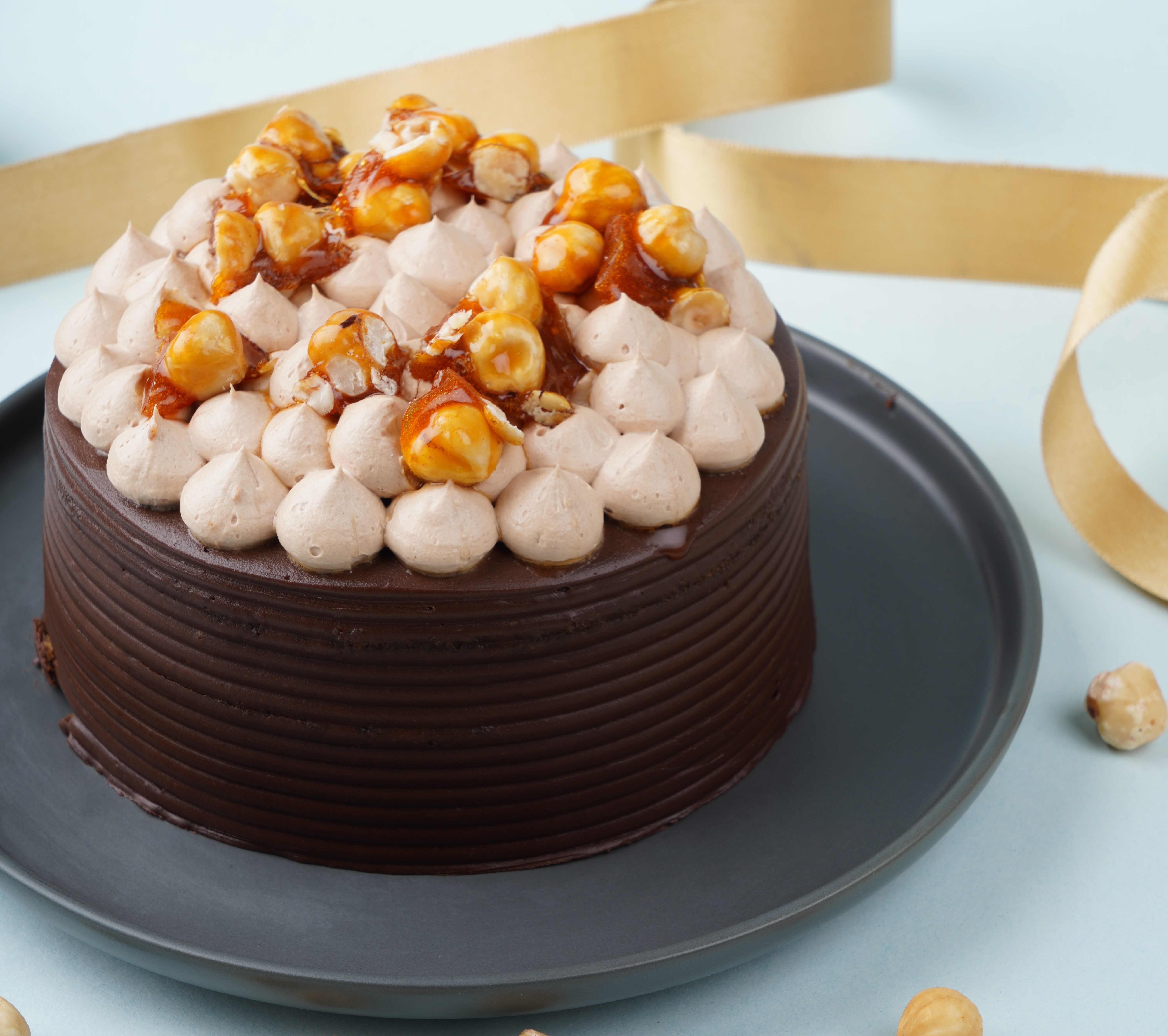Moist, dark chocolate cake with toasted hazelnuts for added crunch, layered with rich, velvety chocolate ganache.