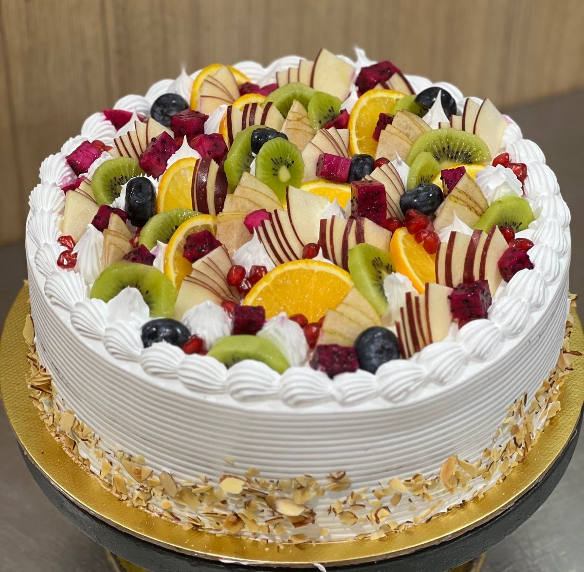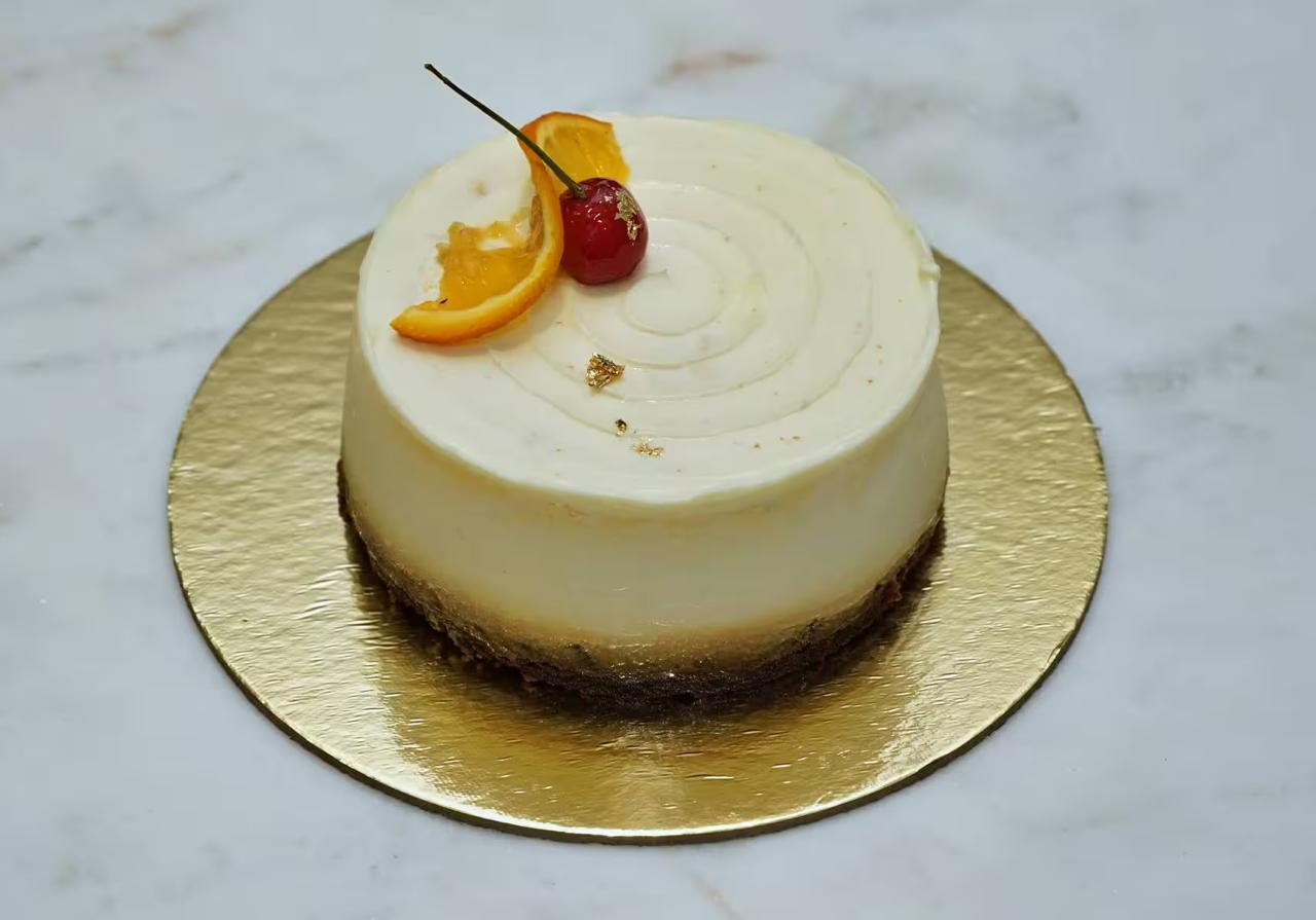 Our signature specialty: a moist vanilla cake infused with mandarin zest, topped with a delightful medley of assorted nuts.