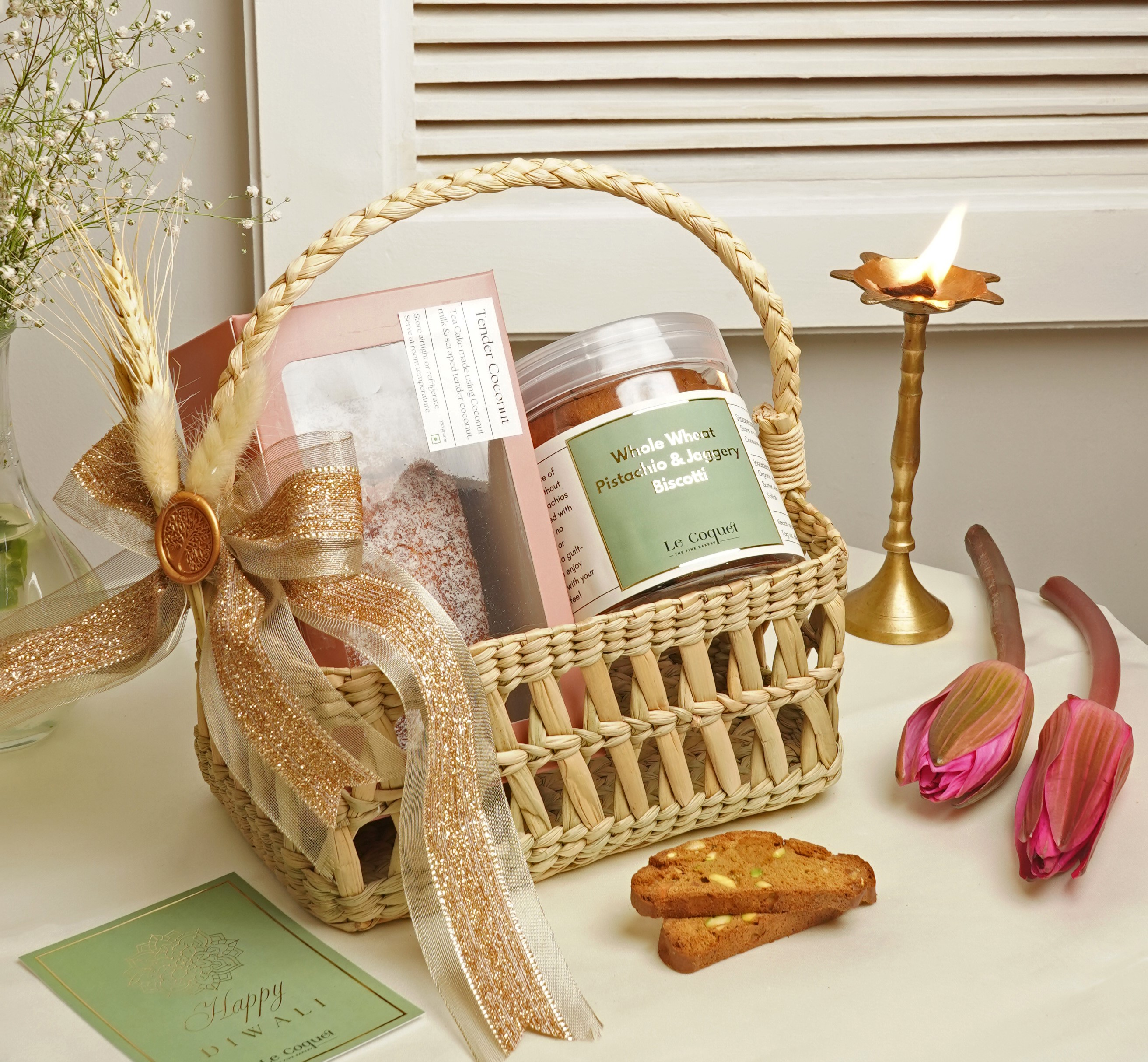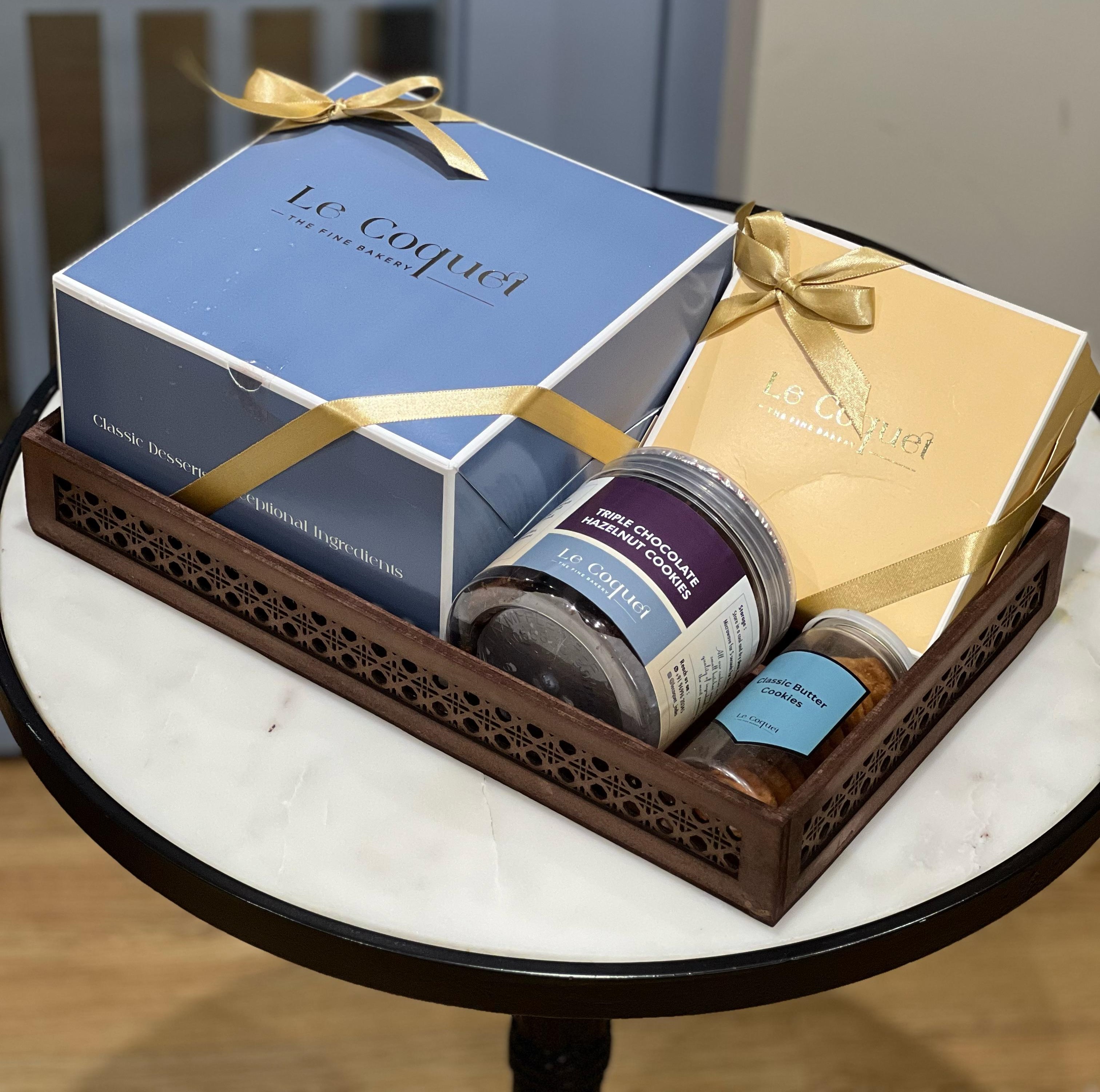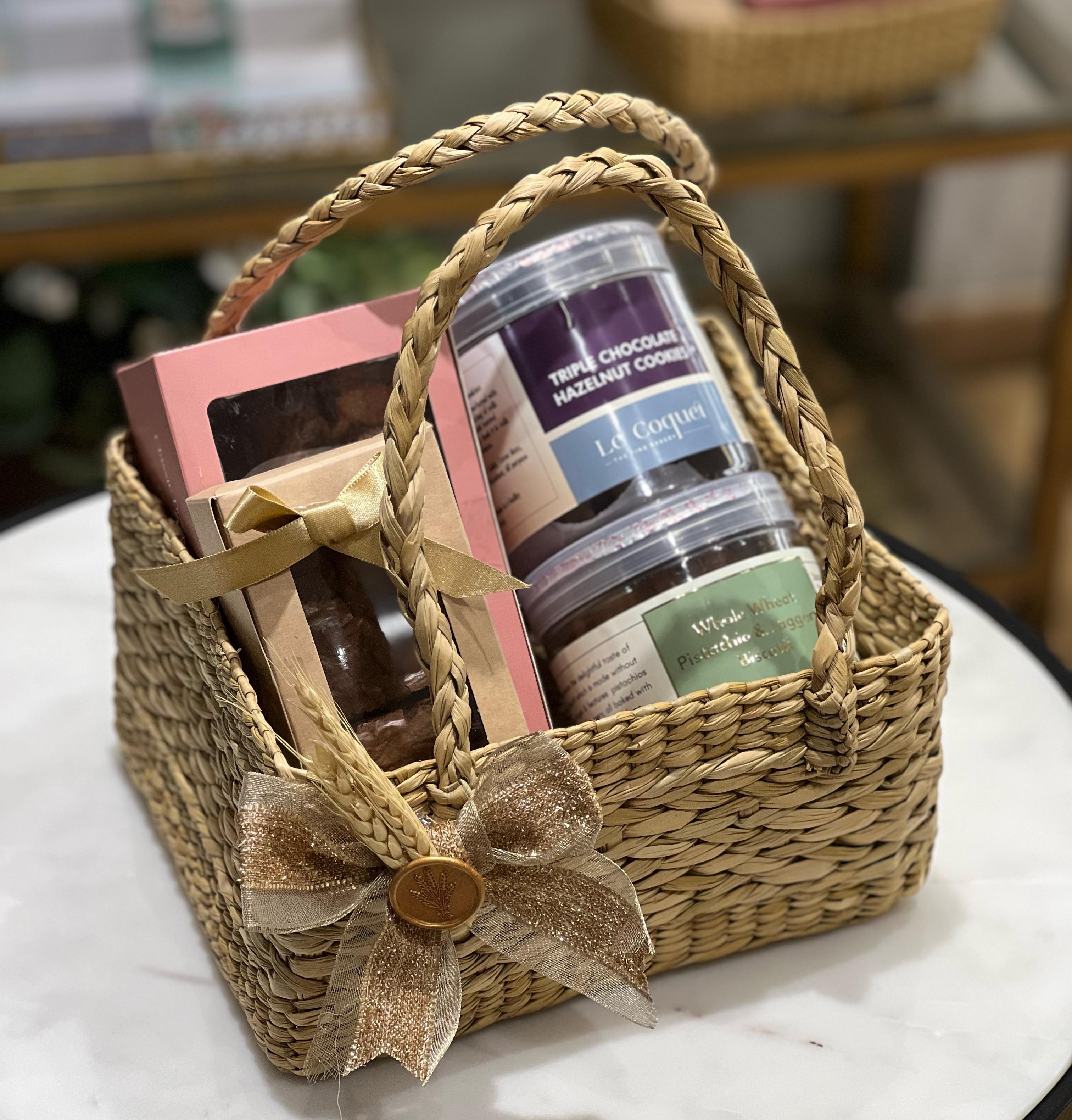 1/2 Kg Cake, Box of 4 Brownies, Any one Jar of Cookies or Biscotti, One Mini Butter Cookies Tin (Packed in our new Rattan Trays)