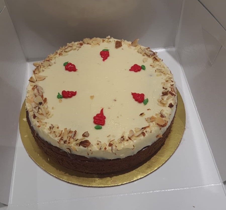 Our signature specialty: a moist vanilla cake infused with mandarin zest, topped with a delightful medley of assorted nuts.