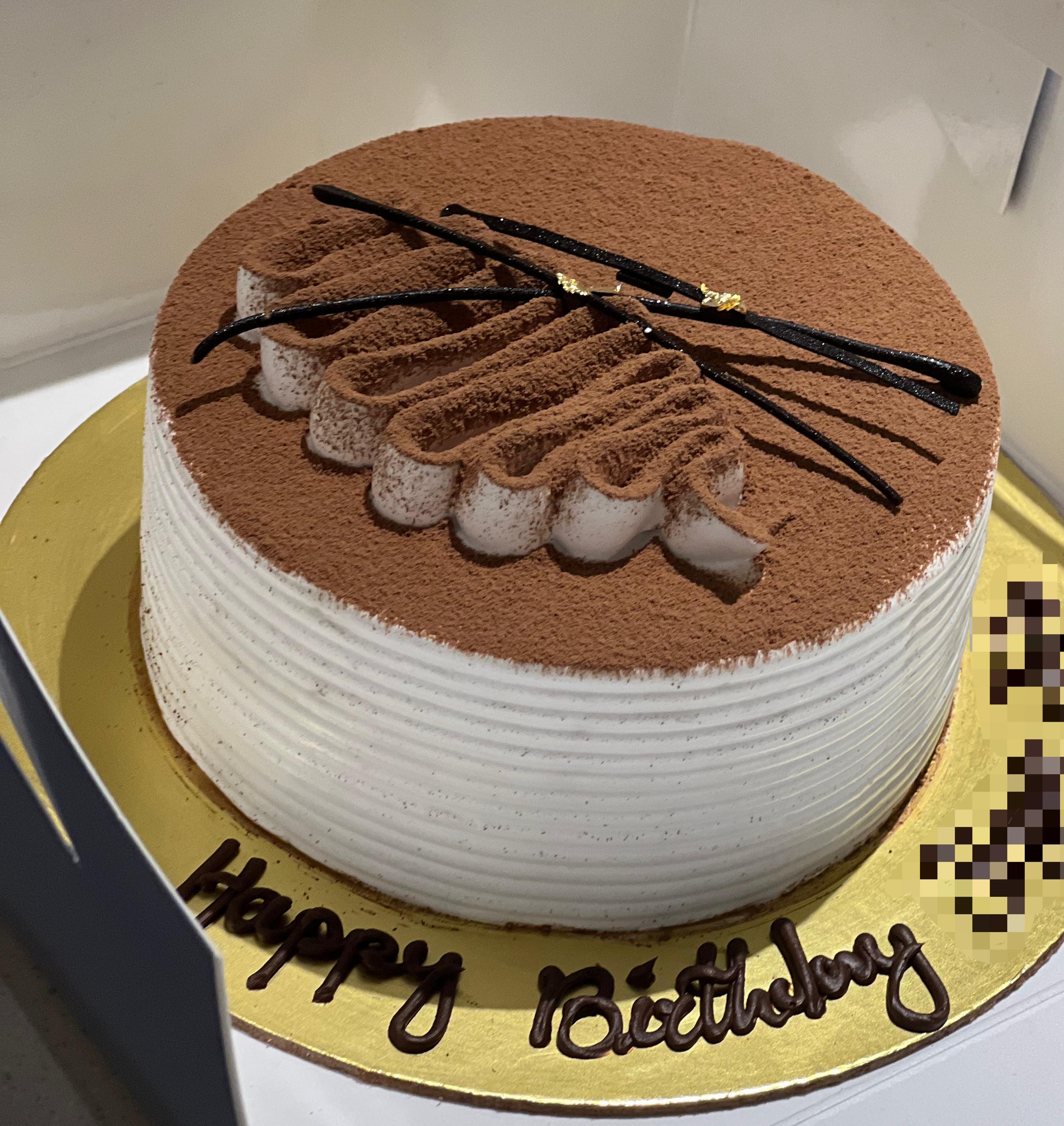 Vanilla Cake soaked in Espresso, Layered with Mascarpone Creme and dusted with cocoa powder.